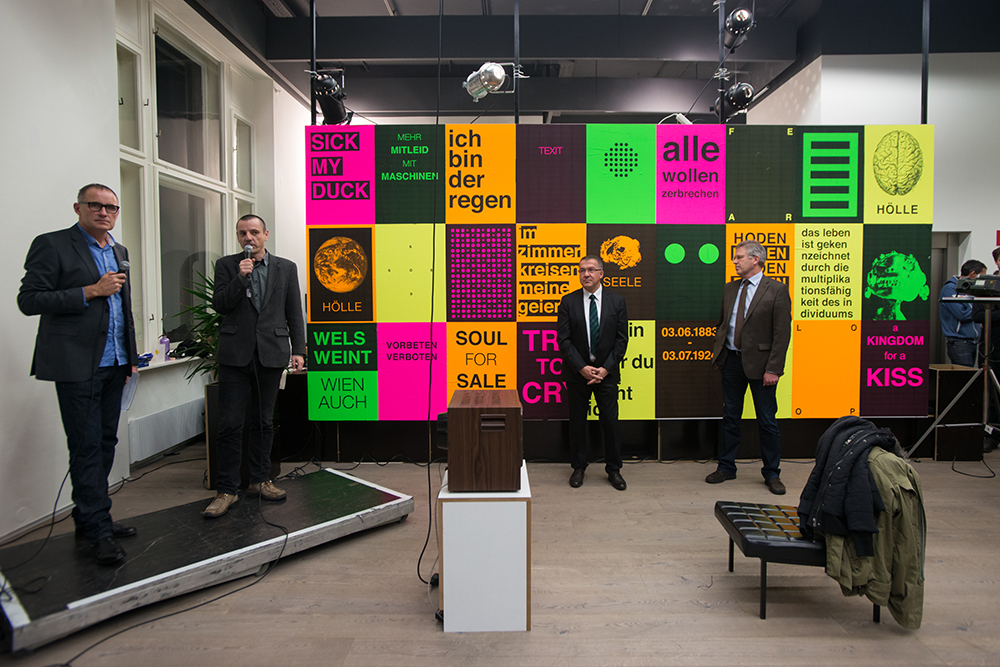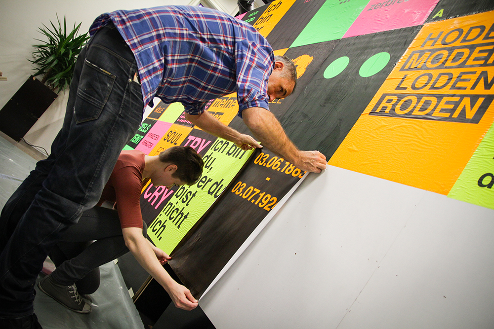 Für die Ausstellung hat Norbert Pfaffenbichler eigens neue Textarbeiten entwickelt, die sich auf das Werk von Marc Adrian beziehen. Im Rahmen eines antizipativen Projekts mit dem Titel „Das bin ich nicht!“ werden die Besucher_innen eingeladen, sich gegenseitig mit bedruckten T-Shirts abzulichten. Die Fotos dieser Aktion werden fortlaufend in der Ausstellung und später in einem eigenen Katalog präsentiert.